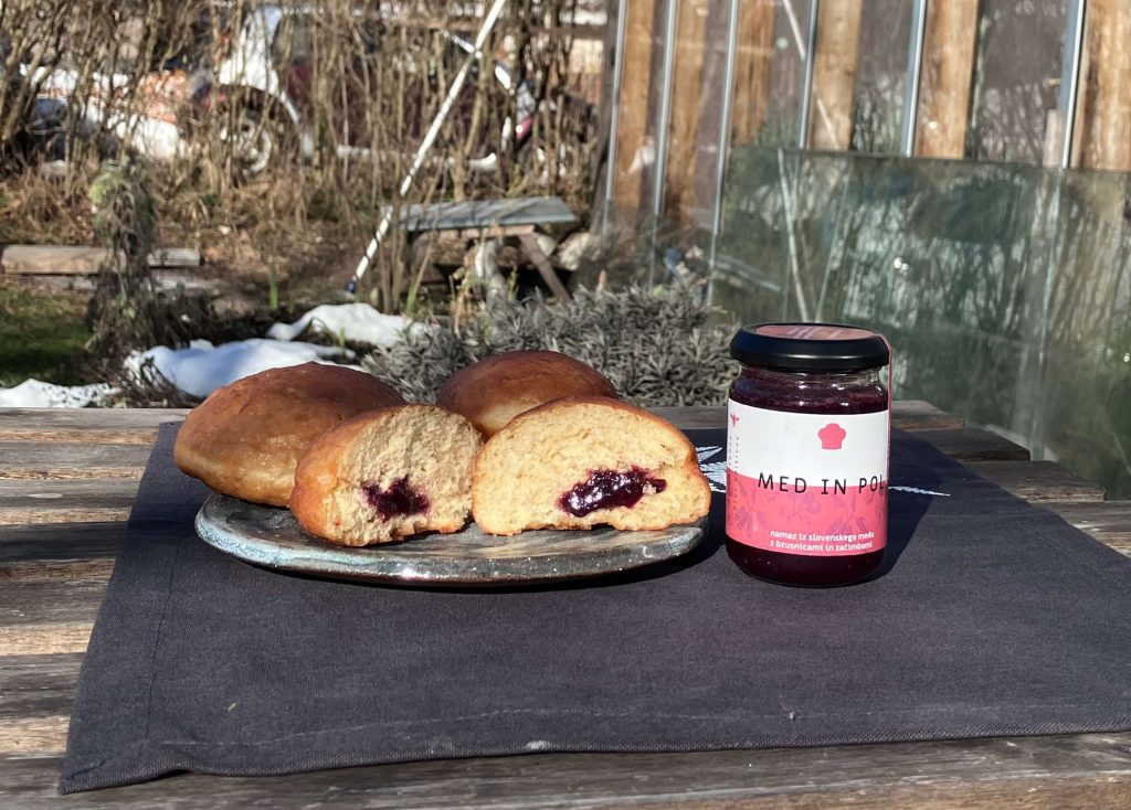 Pečene krofe odcedimo in napolnimo…..z medom oziroma MED IN POL. Izbiramo lahko med brusnico (bolj sadnega okusa) ali pa ČOKO MEDOM. Med v kozarčku postavimo v toplo vodo, da se zmehča in z njim napolnimo krofe.